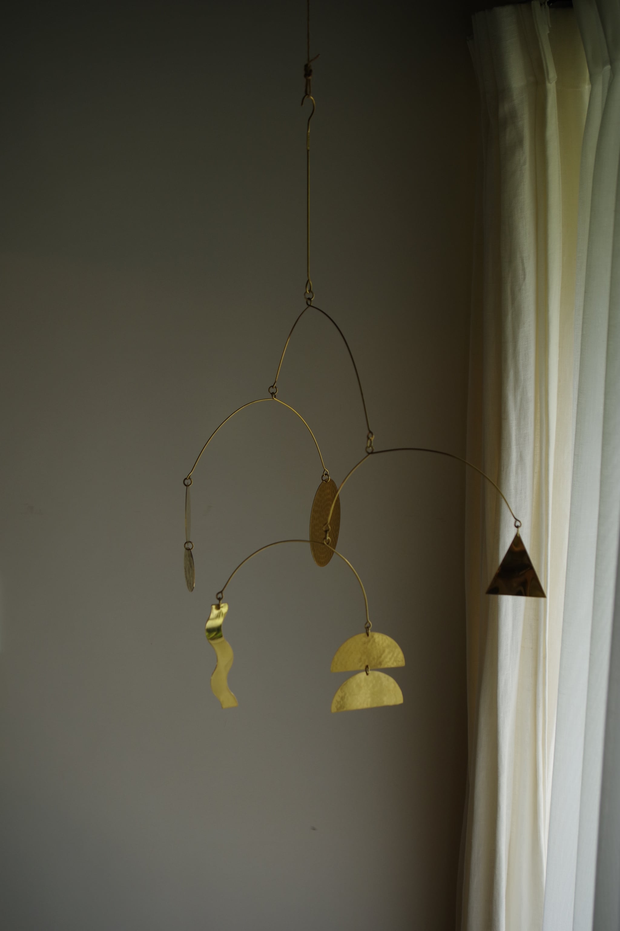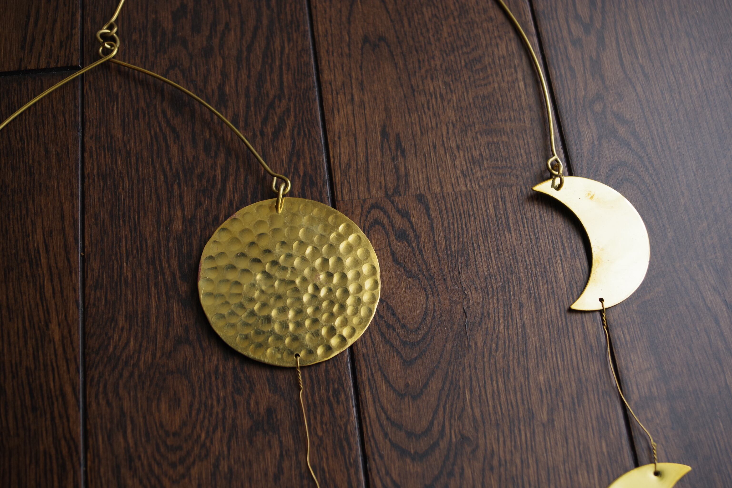 インドで作られた真鍮のモビールです。様々な形のモチーフが付いています。